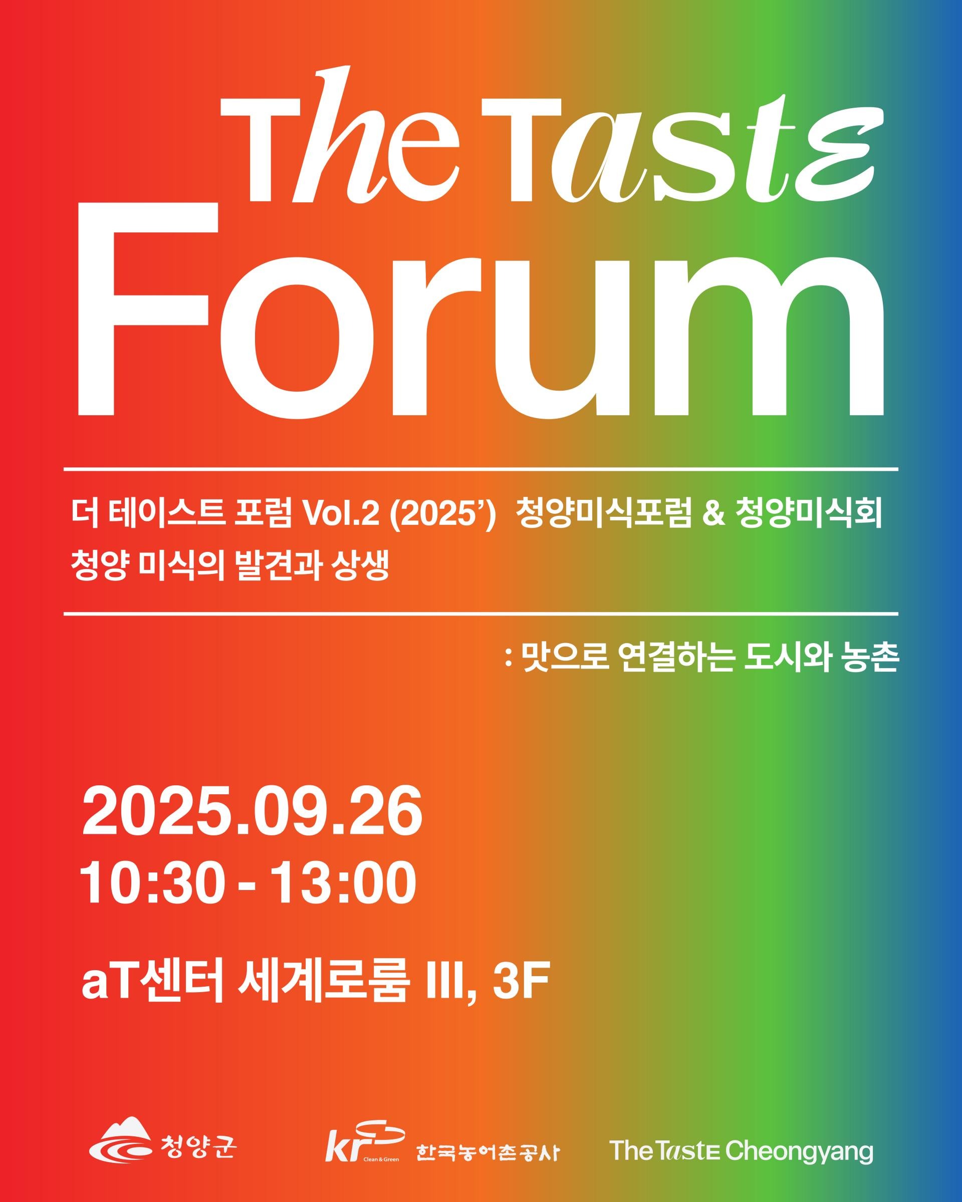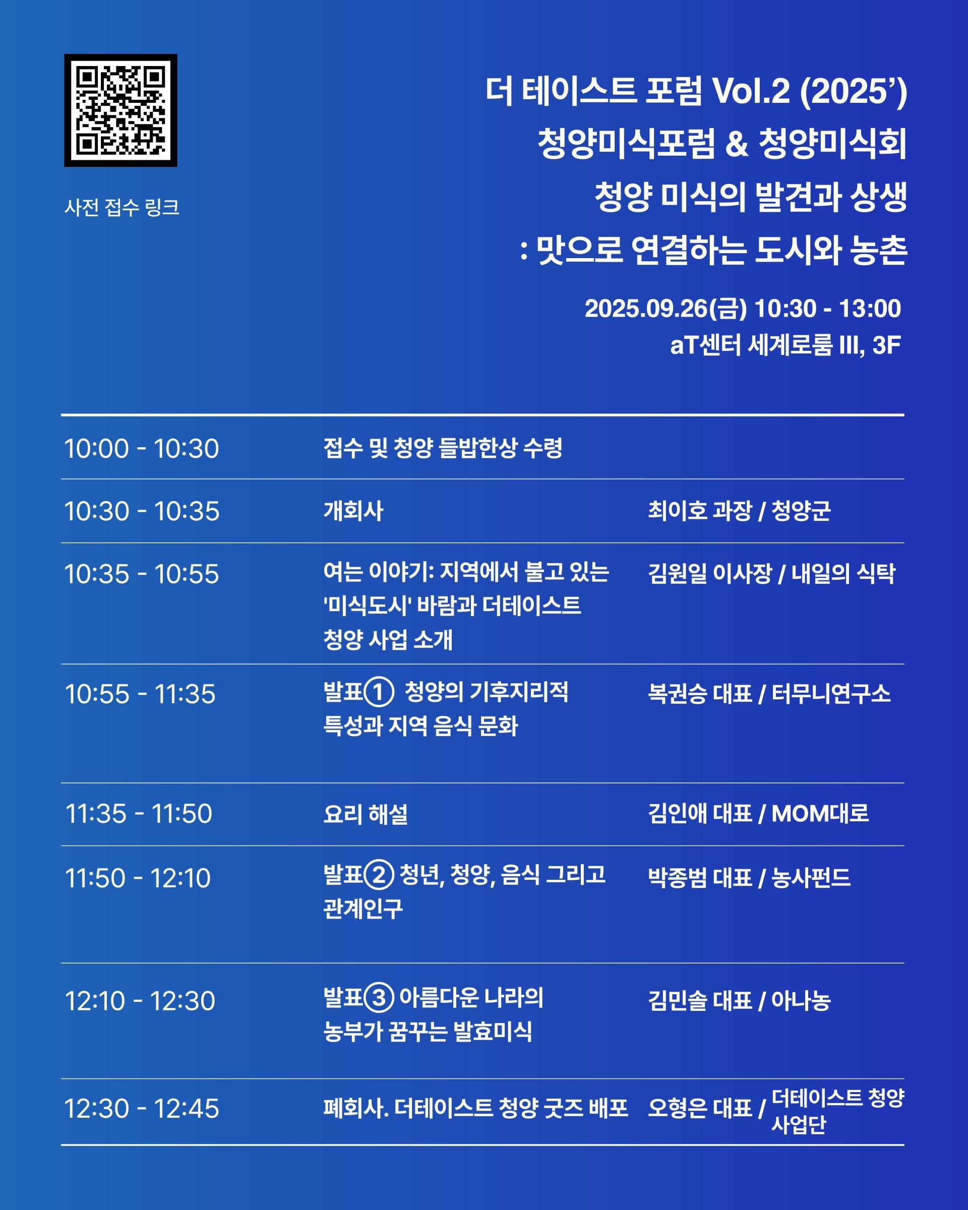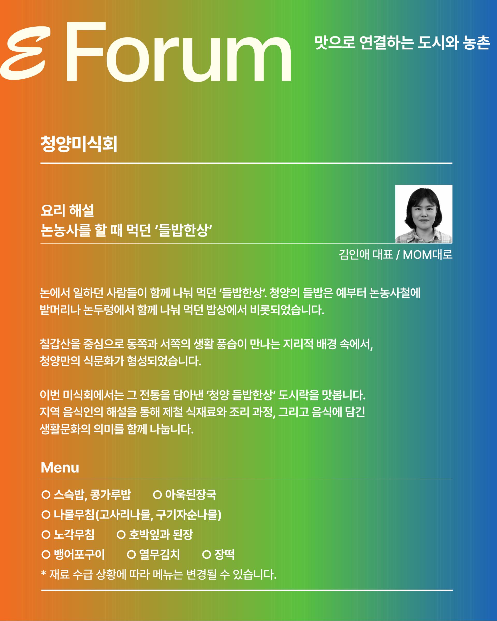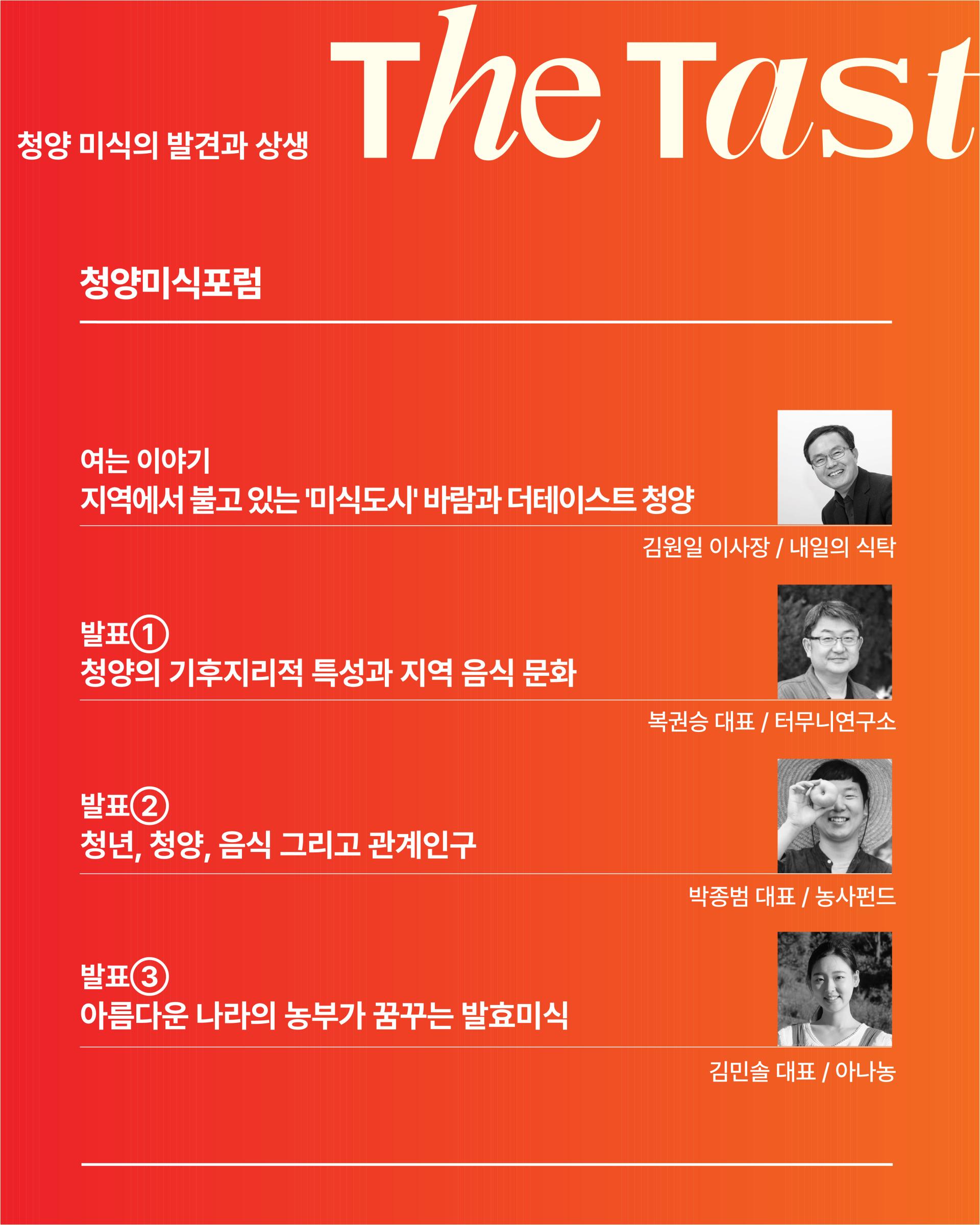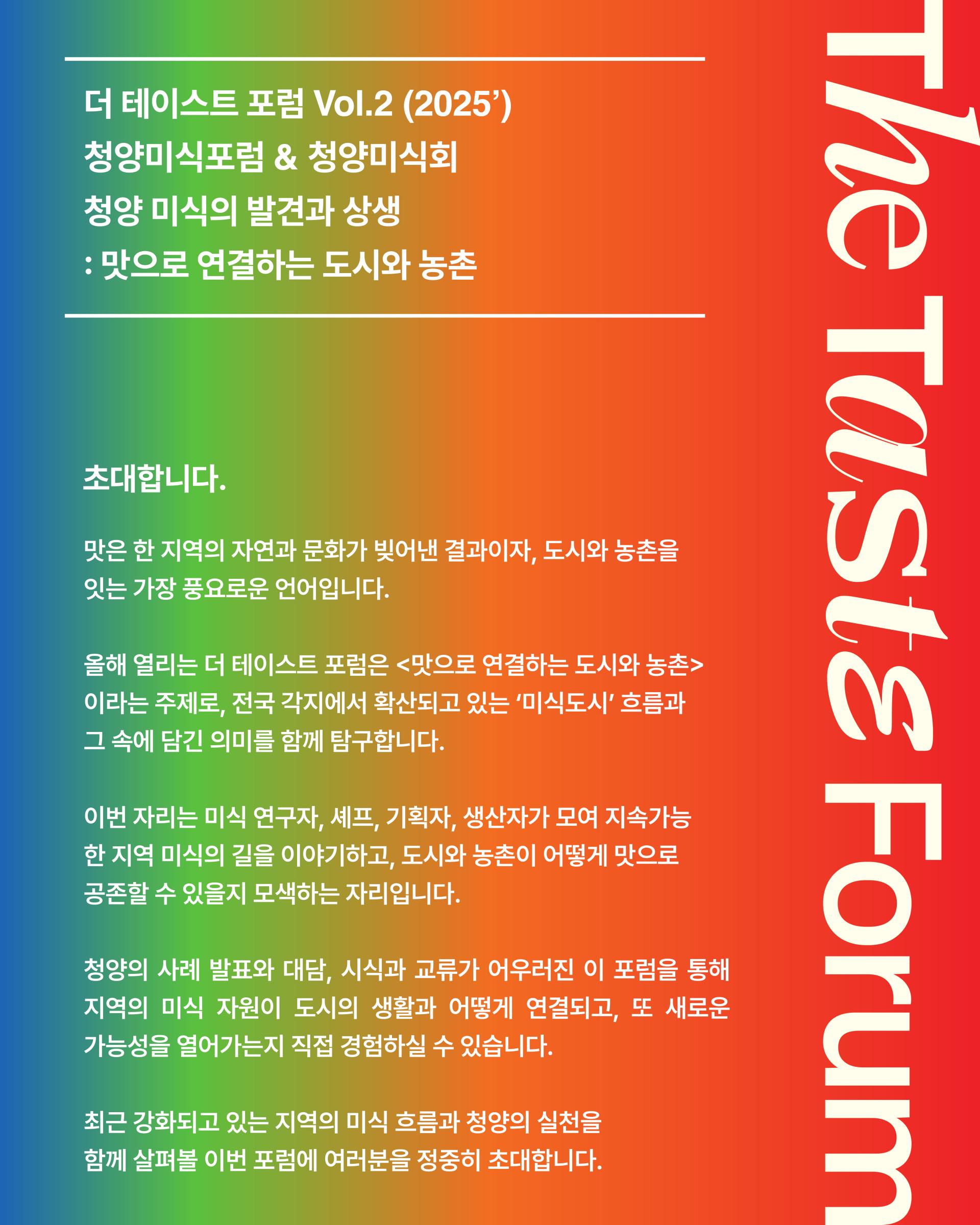 최근 강화되고 있는 지역의 미식 흐름과 청양의 실천을 함께 살펴볼 이번 포럼에 여러분을 정중히 초대합니다.